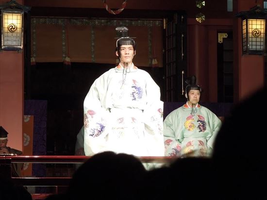 舞楽「登殿楽(とうてんらく)」。平安時代の公達の装束で登場。