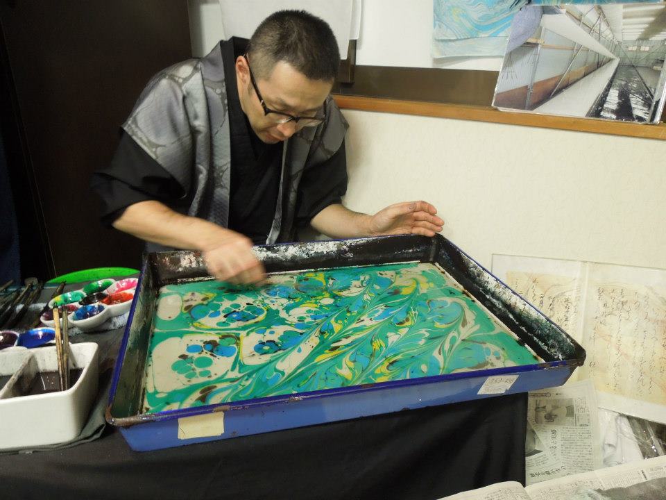 染料を落とし終わったら、棒で軽くかきまぜて波紋のような模様を作ります。この手法はマーブリングともいいます。