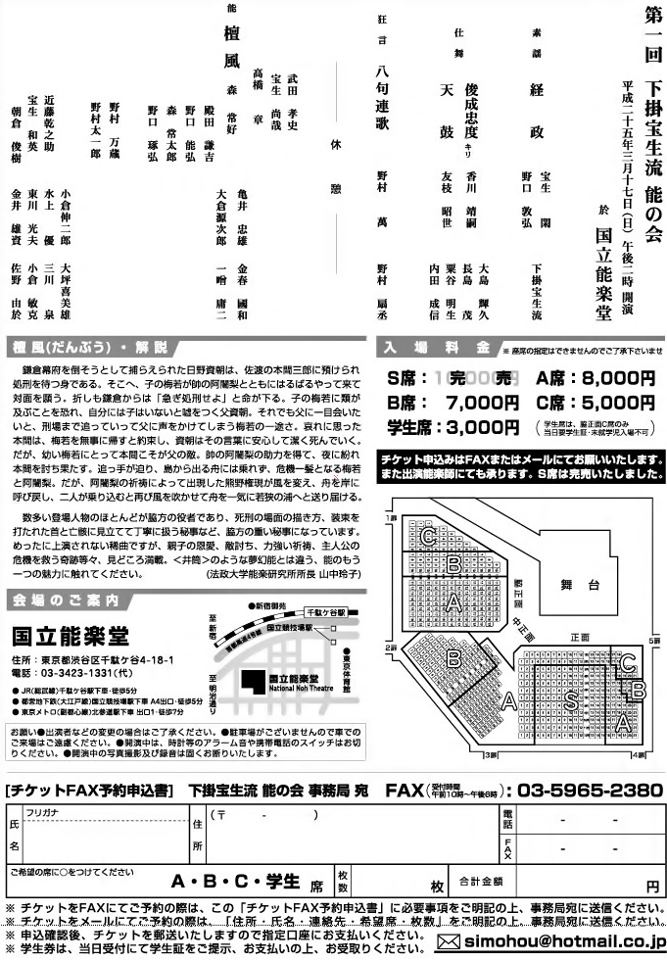 昨日ご紹介した「下掛宝生流 能の会」のチラシ裏面から。