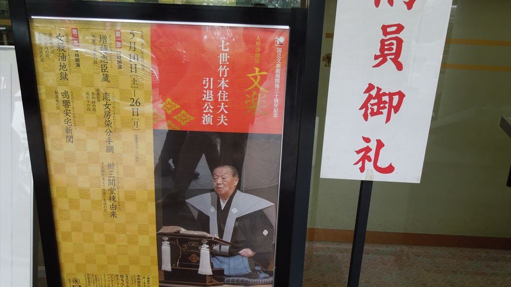 今回は、与兵衛・桐竹勘十郎さん、お吉・吉田和生さん、切場の床・豊竹咲大夫さん、鶴澤燕三さん。簑助玉男バージョンと比べるとはるかにスピード感があり、油で滑るシーンも、正直「滑りすぎなんじゃ…!?」と思ってしまうほど、ものすごい勢いでした。一緒に観た友人が「盗塁のよう」と申していて、言い得て妙(笑)。あれ?という間に殺人シーンが終わってしまっていて、ある意味あっさりした印象を受けましたかな。