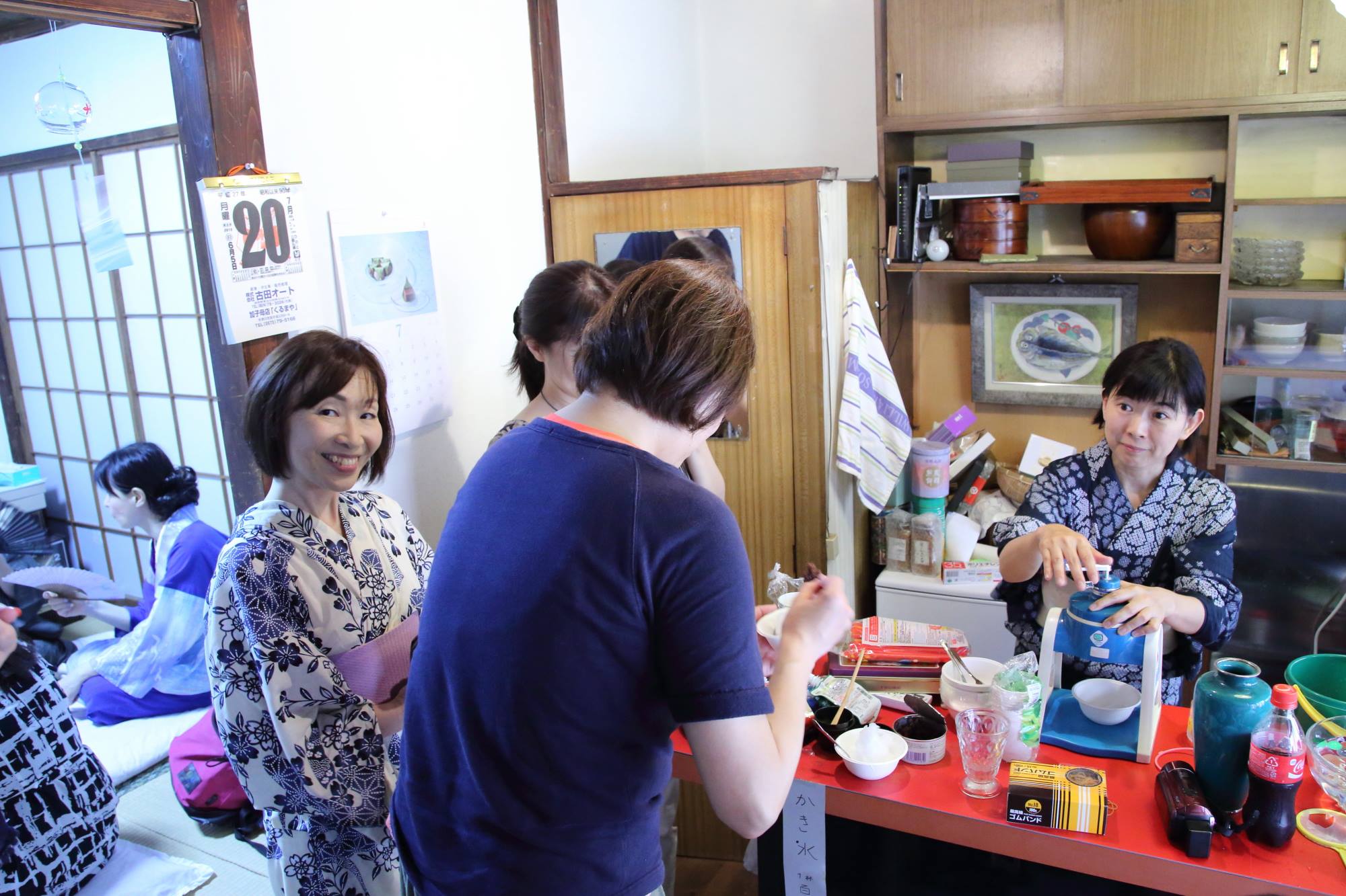 かき氷に群がる我々。氷を削ってもらい、好きな味を自分でトッピング。抹茶あずきが人気です(^Q^)