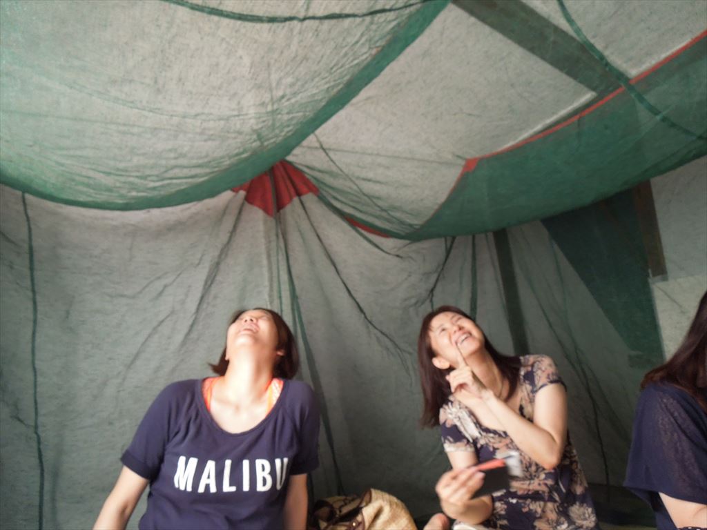 早速、蚊帳の中でお菓子を広げる我々(笑)